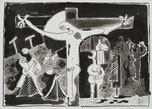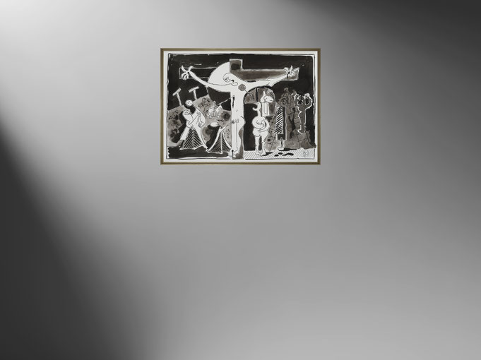 related to the series : Every morning from October 1992 to April 1993 Bernard Morteyrol disciplined himself to make an Indian ink drawing on the theme of the crucifixion. The series presented here is the totality of those directly inspired by the Isenheim altarpiece.