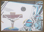 Bernard Morteyrol works on image. An image that he recomposes by use of others coming from classical painting, comics or news. Sometimes even, he uses his virtuosity of mimicry to transcribe the work of a master « in the manner of » another. What he paints is most usually critical of current society and its values ; values he frequently confronts to those of the past by juxtaposing his work with the very most famous artworks of this same past. Out of this eminently political context it also happens to him to bring together two times for the sole purpose of bringing out the funniness of a situation, to show that the reality of today often destroys the dreams or the imaginary of yesterday.